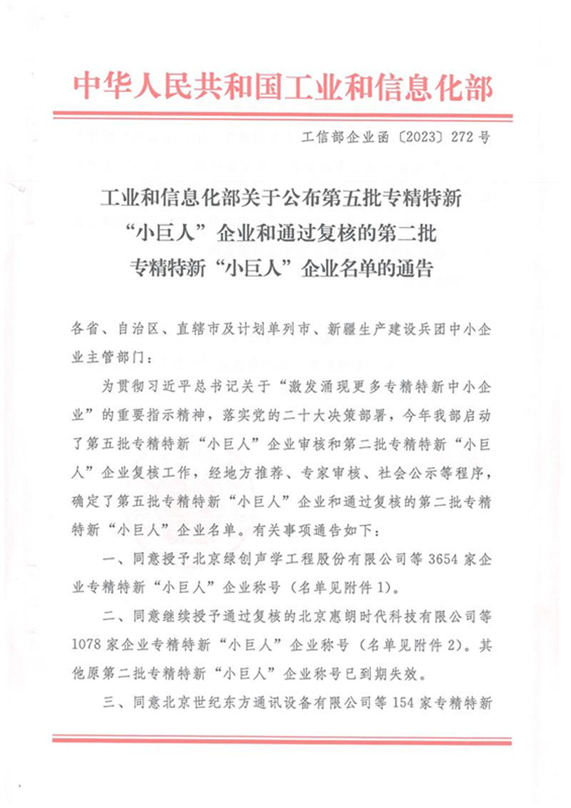 為貫徹習(xí)近平總書記關(guān)于“激發(fā)涌現(xiàn)更多專精特新中小企業(yè)”的重要指示精神,落實(shí)黨的二十大決策部署,工業(yè)和信息化部啟動(dòng)了第五批專精特新“小巨人”企業(yè)審核的工作,我公司榮獲第五批專精特新“小巨人”稱號(hào)。